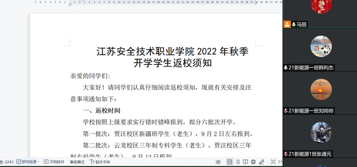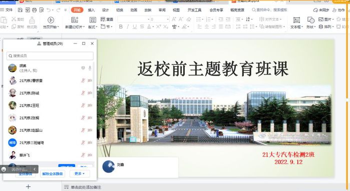 为落实2022年秋季学期学生返校安全工作的各项部署,进一步做好学生返校疫情防控教育,9月12日,交通与安全学院组织各班级召开返校前线上主题班会。