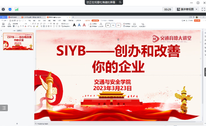 为了进一步提升我院青年创新创业水平,促进创业带动就业,交通与安全学院于3月23日举办了线上线下《SIYB——创办和改善你的企业》 大学生创业教育讲座。本次讲座由交通与安全学院副院长郝旺林主持,辅导员杜海健主讲。