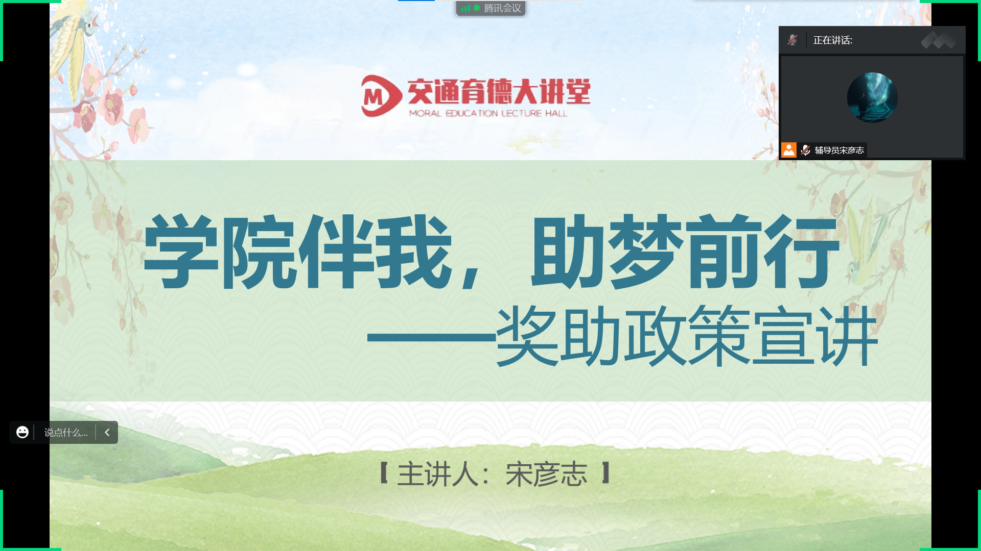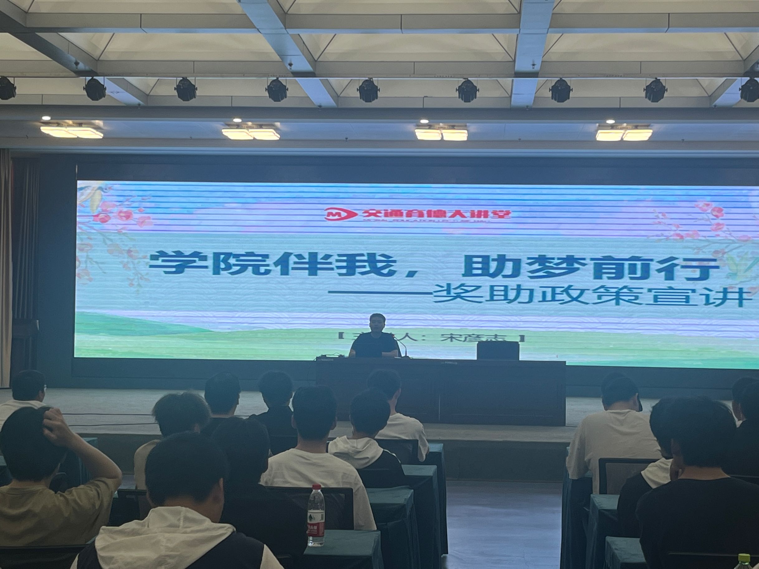 4月20日晚上,在食堂五楼大学生活动中心交通与安全学院“交通育德大讲堂”系列讲座第九期开讲,本次讲座由辅导员宋彦志主讲,主题是“学院伴我,助梦前行——奖助政策宣讲”。交通与安全学院21级、22级同学通过线上与线下结合的方式学习了本次讲座。