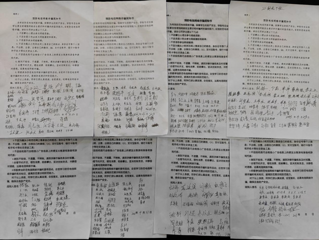 按照电信网络诈骗教育“不漏一班,不漏一生”的原则,向全院学生发起防范电信网络诈骗的倡议,组织学院全体同学签订《预防电信网络诈骗阅知书》,提醒同学们要认真阅读,自觉落实,时刻紧绷防范之弦,远离电信网络诈骗,确保自身财产安全。