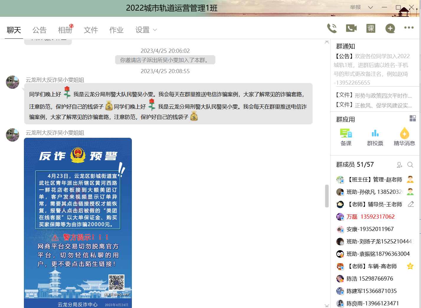学院与店子派出所展开防范电信网络诈骗常态化合作,辅导员全部添加防诈专员吴警官微信,并将吴警官拉至每班班群里。吴警官每天向学生们推送诈骗警情案例,通过长期警示教育,久久为功,争取实现院校零发案。此外,学院要求学生下载国家反诈APP、添加社区民警微信,通过上述一系列措施,为学生筑起一道防火墙,保护学生免受诈骗侵害。