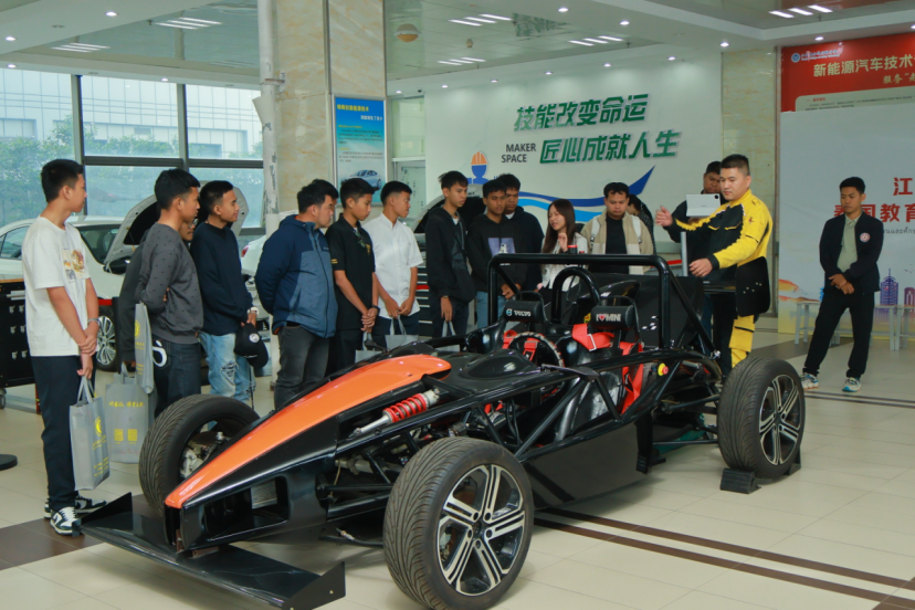 随后,代表团参观了新能源汽车实训基地,在专业教师引导下,依次了解动力电池检测区、驱动电机拆装区、高压系统模拟区等功能区域。学院教师结合比亚迪E5、吉利EV450等实训车辆,演示了电池包绝缘检测、电机控制器原理等实操内容,泰国师生不时驻足提问,围绕实训设备配置、教学项目设计展开深入交流。