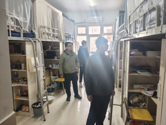 郝旺林副院长则重点关注宿舍设施的完好情况及卫生死角。针对检查中发现的部分宿舍存在物品摆放杂乱、阳台堆积易燃物等问题,郝院长现场提出了整改意见,并要求随行的辅导员老师做好登记、建立台账,明确整改时限,实行管理。