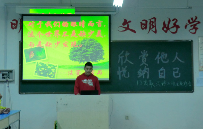 | 为了促进班级和谐,营造良好的班级氛围,帮助同学们学会接纳自己的优点和缺点,学会欣赏他人,提高自信心。11月23日晚自习,我系13高职汽修2班开展了以《欣赏他人,悦纳自己》为题的主题班会观摩活动。系学管主任陈斌、全体班主任、部分学生代表参加观摩。 班会利用人生寓言、性格测试、演讲、诗朗诵、小品、“夸夸我的同学”等多种形式的活动,来展示、发现、更深的了解自己身边同学,从而起到团结同学,构建健康向上和谐的班级氛围,及形成正确的待人接物的人生观、价值观和交友方法,学会从一个乐观、积极的角度欣赏他人、欣赏自己、欣赏学校等。 这次班会的召开,帮助同学们更好地认识自我,了解他人,提高了同学们自我认知能力、表达能力,学会了如何赏识他人。 (文/图:周旺红)