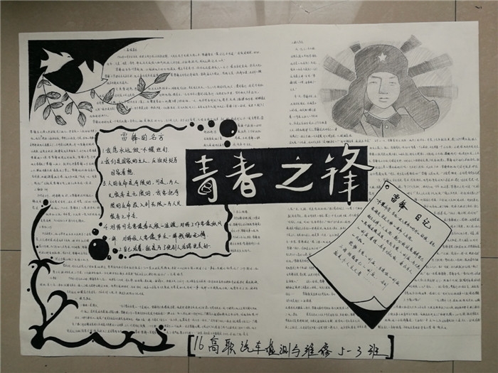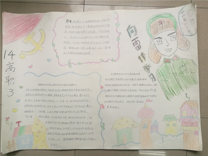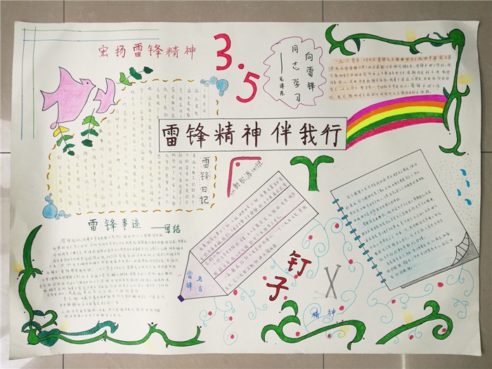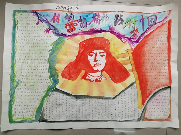 活动中,同学们收集雷锋的生平事迹,雷锋故事、雷锋名言等资料,以雷锋肖像、雷锋日记、雷锋故事、名人题词、学雷锋感悟等为主要表现内容。手抄报主题鲜明突出、版面设计精美、文字图画优美生动、色彩搭配充满创意,绘画生动形象、惟妙惟肖,充分表达了对雷锋同志的深深敬意。