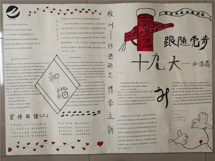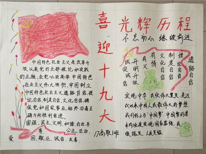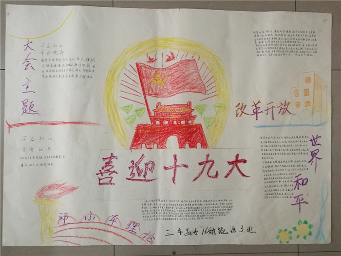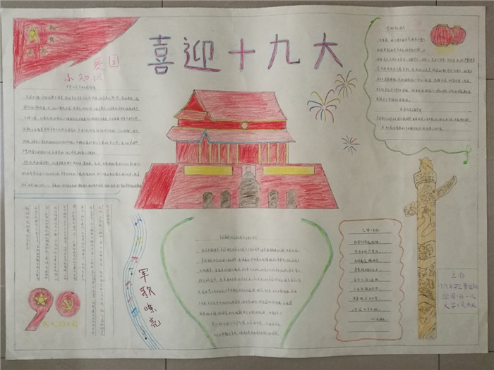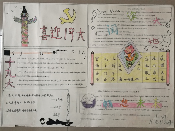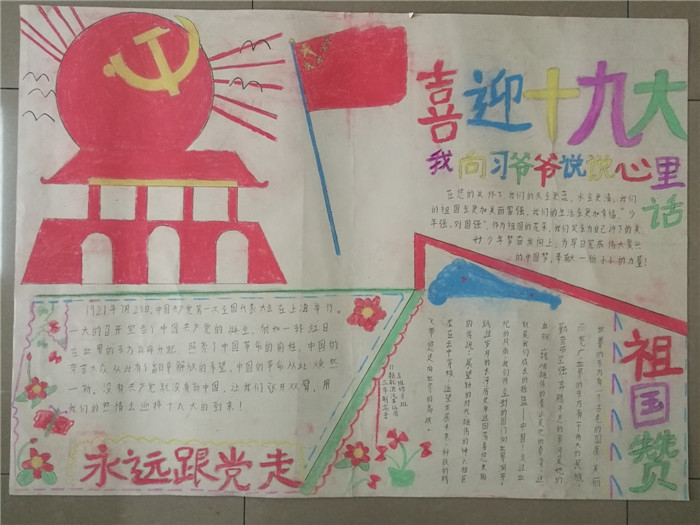 活动中,同学们用自己手中的画笔,创作出一幅幅主题鲜明、构思巧妙、色彩鲜艳的手抄报作品,饱含了大家对十九大的期待和自己对祖国的无限热爱。作品中,有写给习近平总书记的信件,有的表示了对习近平总书记的敬仰之情,有的表达了对祖国的美好祝福,有的则立下了成为祖国栋梁之材的梦想和志向……