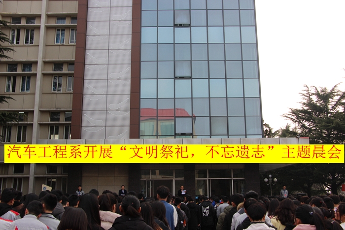 又是一年清明时,哀思如潮祭先祖。4月1日早,汽车工程系贾汪校区开展了“文明祭祀、不忘遗志”主题晨会,党支部书记张允志,学管副主任王冬萍、郝旺林,全体班主任和1200名学生参加。4月3日,汽车系33个开展主题班团课。