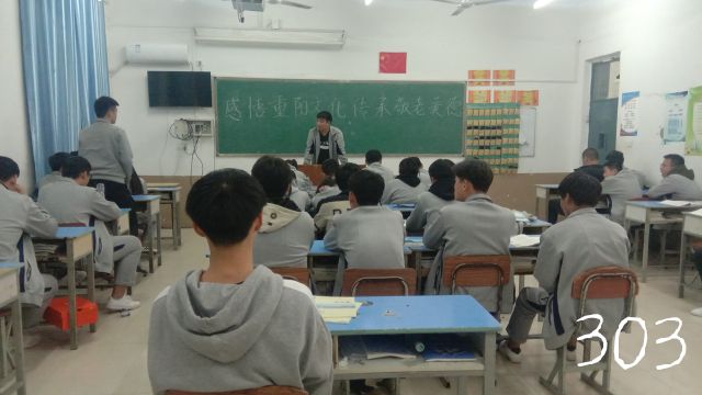 下午七点,各个班级同学到齐后,班长和团支书配合班主任老师带领同学开班会,班会共两项议程,第一项议程,观看新闻联播节目,提高同学对国家社会的认识。第二相项议程,由班主任主持,请同学们积极发言,向全班同学讲解自己对重阳节的认知,并对中国其他传统节日的了解。激烈的演讲后,班主任老师为同学们进行总结,做出要加强对中华传统节日的认知,要求大家在重阳节中反思自己日常是否敬老,爱老,护老。