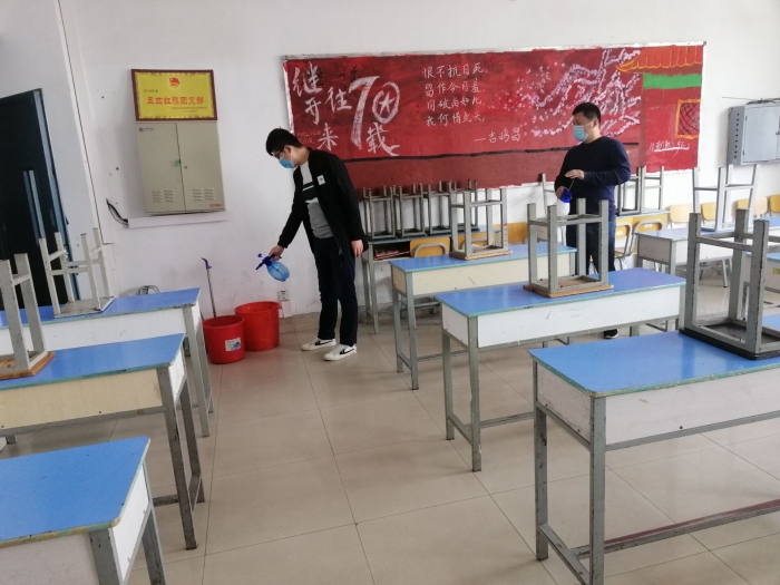 为了保障学生返校安全,近日我系两位辅导员老师每天对教室和宿舍进行全面细致的消杀工作。