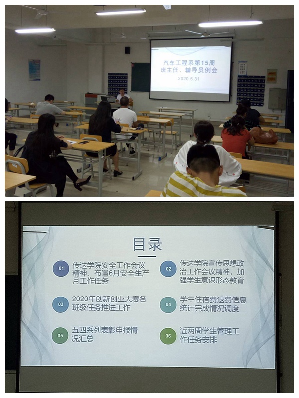 5月31日晚上,汽车系在教一楼508教室召开第15周班主任辅导员例会,学管丁主任主持。