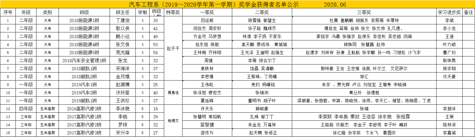 汽车工程系(2019~2020学年第一学期)奖学金获得者名单公示