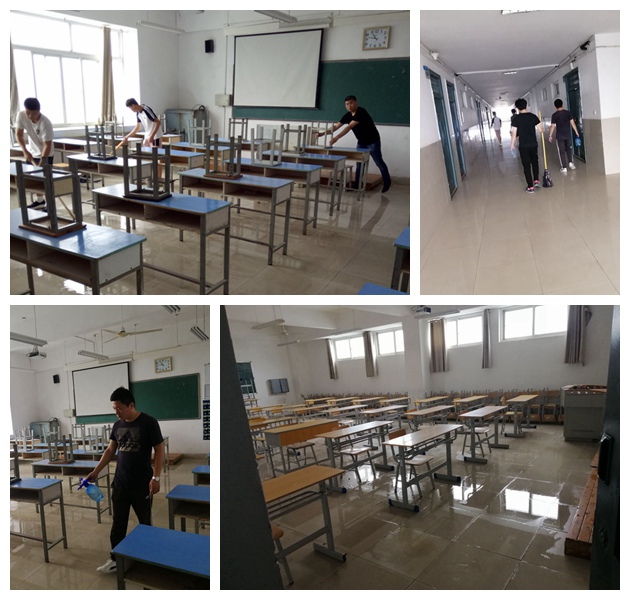 为了迎接文明校园检查,保证教室卫生、干净、整洁,7月2日上午,汽车系丁主任带领辅导员老师和部分学生骨干对系部的各教室进行卫生清扫和消杀工作。