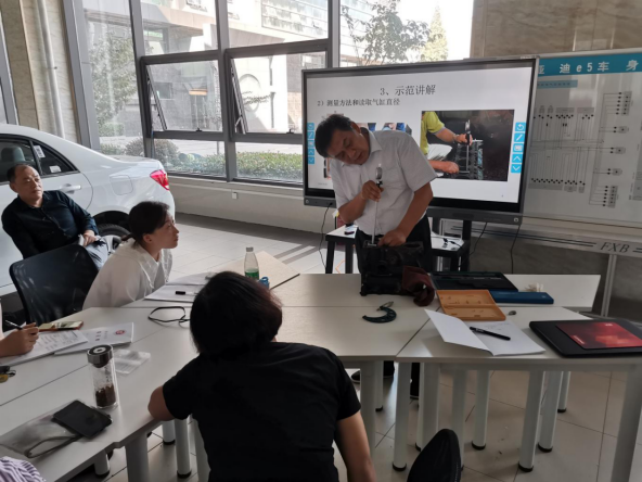 为进一步激励全体教师不断改进教学方法,提高教育教学质量,9月18日,交通与安全学院在云龙校区新能源汽车实训中心开展了公开课交流活动。本次公开课由教学经验丰富的专业课骨干教师冯长征老师主讲,主要展示理实一体课堂课教学的教学设计与组织,汽车系全体教师参与听课交流。课上,冯老师熟练的理实一体教学组织和规范的实操教学演示获得了全体教师的一致好评。课后全体教师也针对教学活动的设计、教学过程的实施及教学材料的准备等方面开展了交流讨论。
