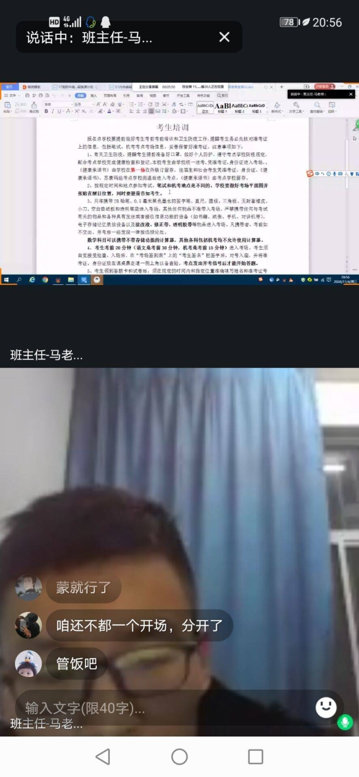各班级认真传达会议精神,主要从以下三个方面进行强调:1.考试时间和地点,要求班主任通知到每位学生,提前安排好住宿,不要错过考试时间,特别是8号的英语考试,一定按照准考证的安排到指定地点进行机考;2.考生需要携带的东西,准考证,有效身份证件,苏康码,个人行程码,健康承诺书,携带笔和必要画图工具3.要求每位考生坚持诚信考试,严禁作弊。