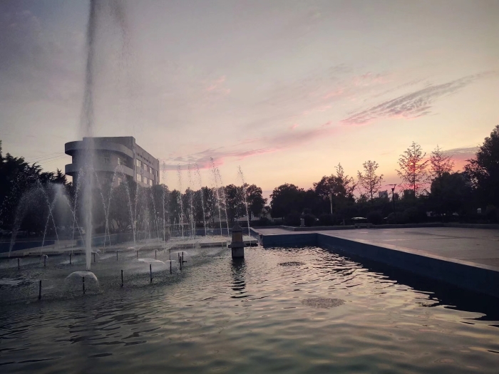 夕阳下的太阳染红了天边照应着美丽的校园,池中的喷泉源源不断,一层层浪花飘荡在水面正如我们美丽的校园生活在一点点一滴滴的流逝。也许校园生活有高潮,有落败,有摇荡不定,也有停滞不前,但希望也像着喷泉一样勇于攀高不畏艰险。(19城轨一班 魏梓炎)
