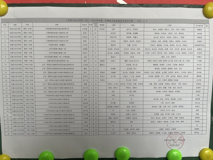 交通与安全学院2021-2022学年第一学期奖学金获得者名单