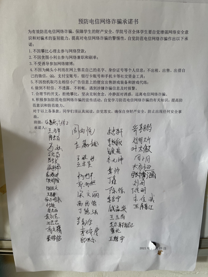 为维护我院师生权益,做好有效防范,提高大学生针对电信诈骗犯罪的识别和应对能力,根据学管主任邓主任要求,学院现开展每人以班级为单位签署一份防范电信诈骗承诺书的活动。