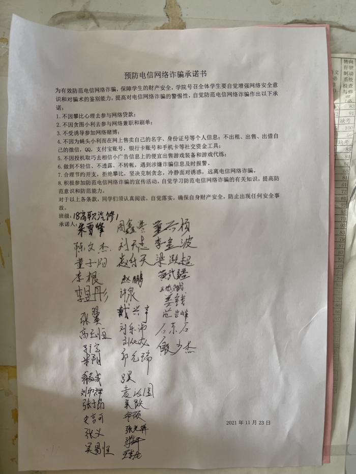 我院全部740名在校学生在11月23日的晚自习参与了签署,从根本上提高学生的防范意识,全面落实打防管控措施,坚决遏制电信网络诈骗犯罪多发高发态势。